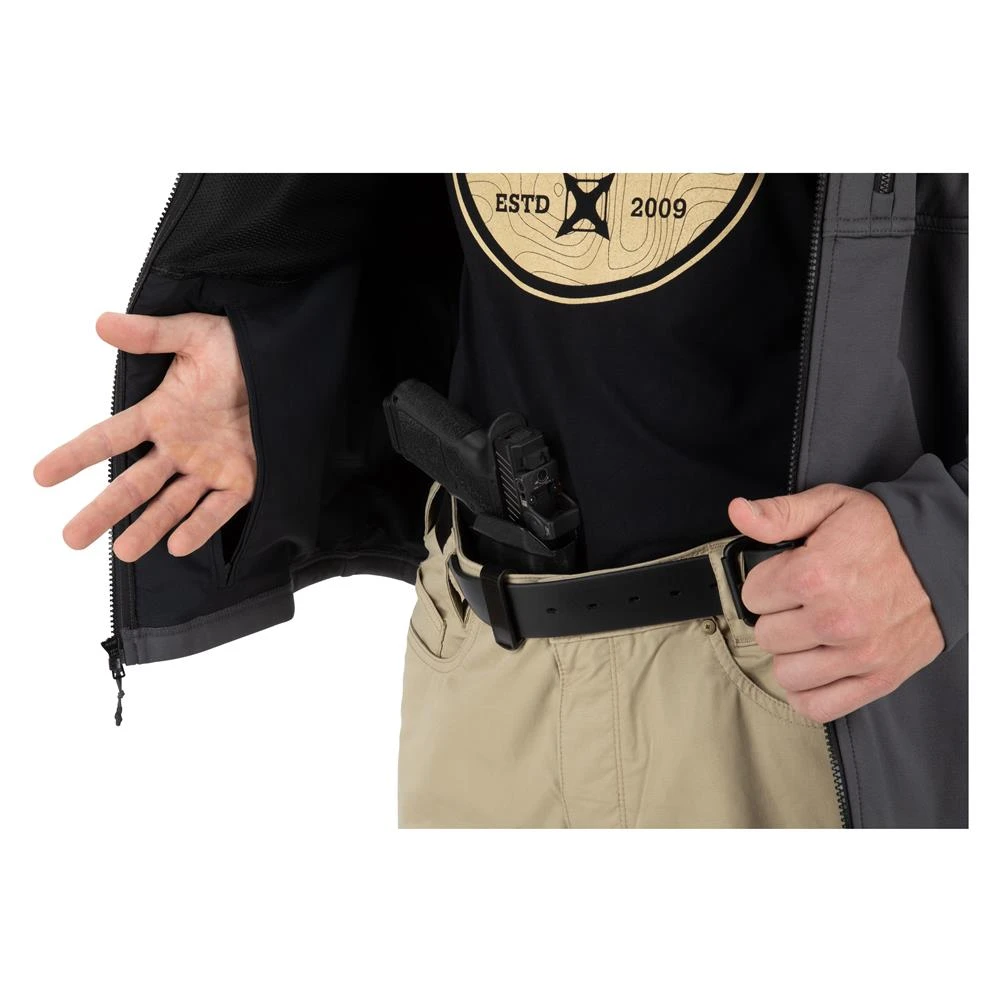 - Vertical zippered pass-throughs concealed inside zippered hand pockets allow discreet access to appendix-carry items