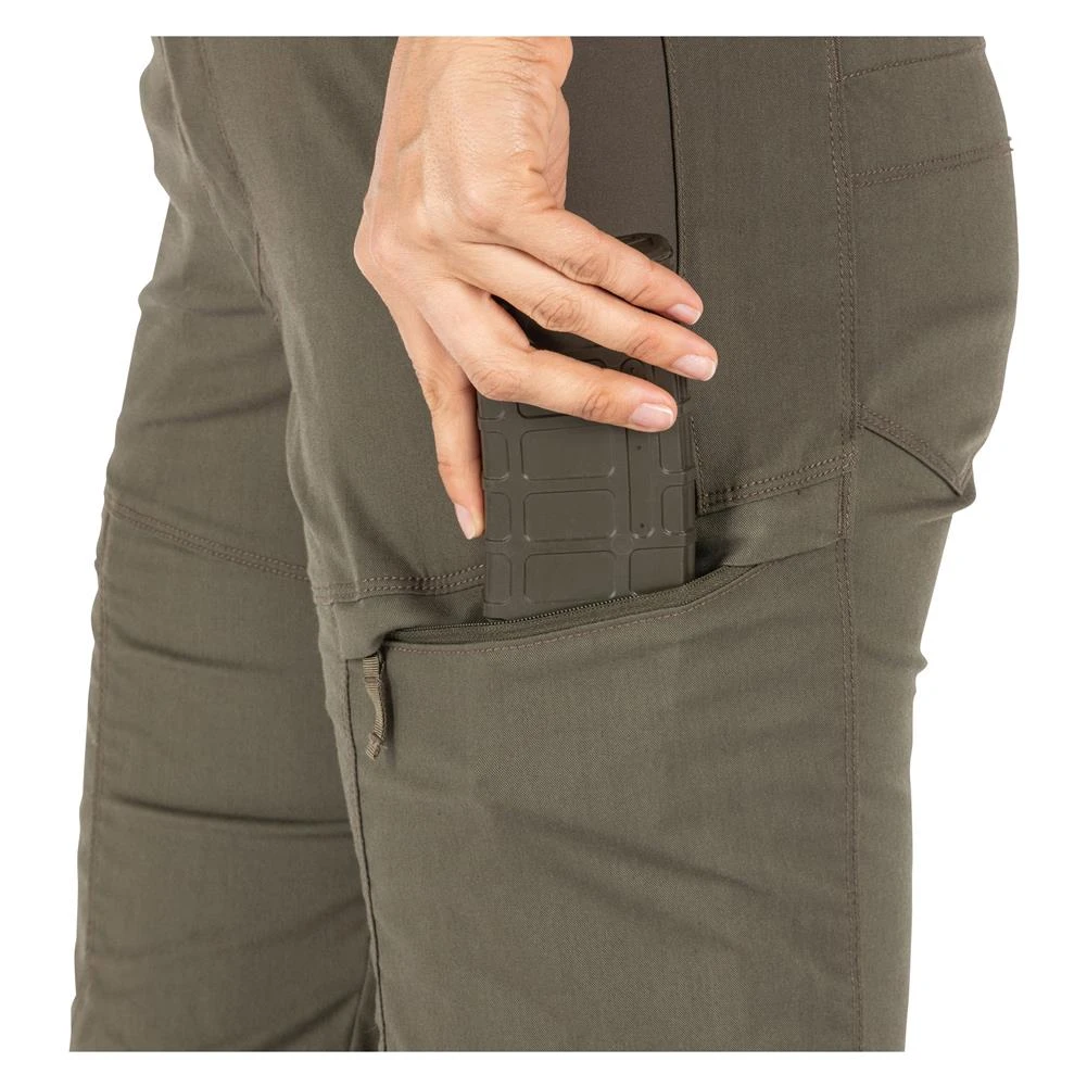 Flex-Tac mechanical stretch canvas combined with a Teflon finish to deliver unimpeded mobility and supreme stain performance in a woman’s pant. The Women’s Apex Pant has been designed with input from female first responders and they feature a comfort waistband, low profile cargo pockets and extra rear pockets. Got gear? The lo-pro cargo pockets secure with a zipper closure that provide internal magazine pockets, while waist pockets offer covert storage for flex-cuffs and a handcuff key hidden at the rear and inside bottom hem. The additional twin pockets at the rear will stow more mags or like-sized item, should you need it, and maintain a clean, unobtrusive profile if you don’t. Oh, and are you carrying a knife and/or EDC light? Of course you are, so we’ve reinforced the clip area of the pocket with Nylon 6. Walk, run, hike, climb, jump, fight…it’s all the same to the Apex.